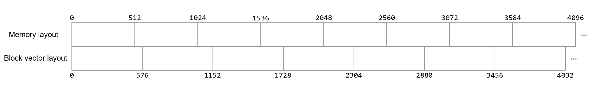 Block vector types are unable to be loaded directly using the standard load APIs due to their sizes exceeding the core memory interface. An additional complication that arises due to the size mismatch is that while the first load may be well aligned, this would result in the second sequential load being misaligned. For example, if the core memory interface is 512b and a block vector size is 576b then each load would consist of two 512b loads and some additional processing to combine the data from each load correctly the ensure only the intended data is combined into the final loaded values. See below.