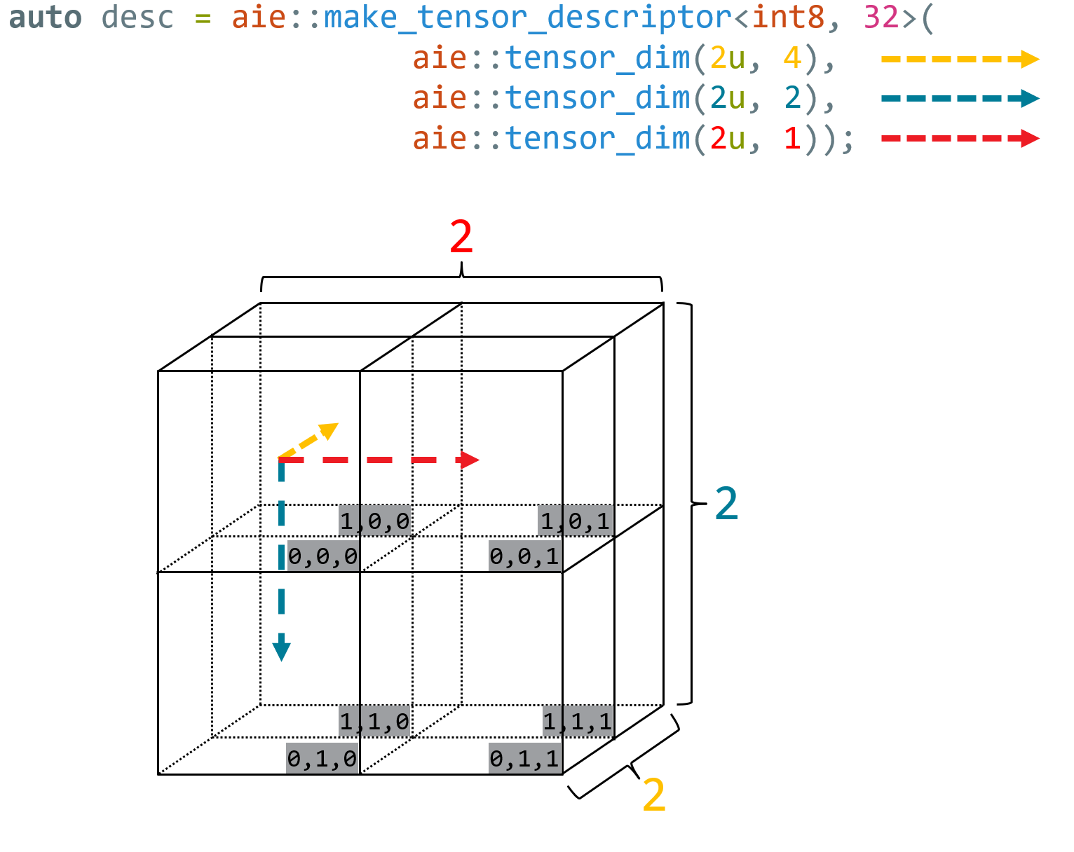 The following illustration shows how a 3-D volume can be described. Here the element type is int8, and the number of elements per block is 32, resulting in segments of the tensor being aie::vector<int8, 32>. The size of each dimension is given in the first paremeter of each aie::tensor_dim, while the size of the increment required to take a step in each dimension given as the second parameter. Note that this example assumes that the data is laid out in row-major order. This tensor representation allows a subvolume of the tensor to be iterated over a number of times by adding an additional aie::tensor_dim with step set to zero snd the size set to the desired number of iterations. See Tensor Buffer Stream Composition for an example.