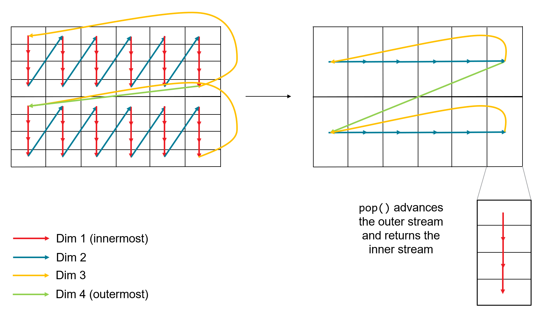 Such a tensor descriptor may be used to construct a tensor buffer stream as shown below. The returned stream serializes the accesses to the buffer as it is read, which is also illustraded below.