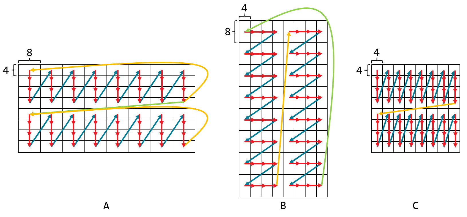 Below is an example of an optimized bfloat16 GEMM kernel in which both input matrices, A and B, are addressed in the following 4D patterns (see Tensor Buffer Streams):